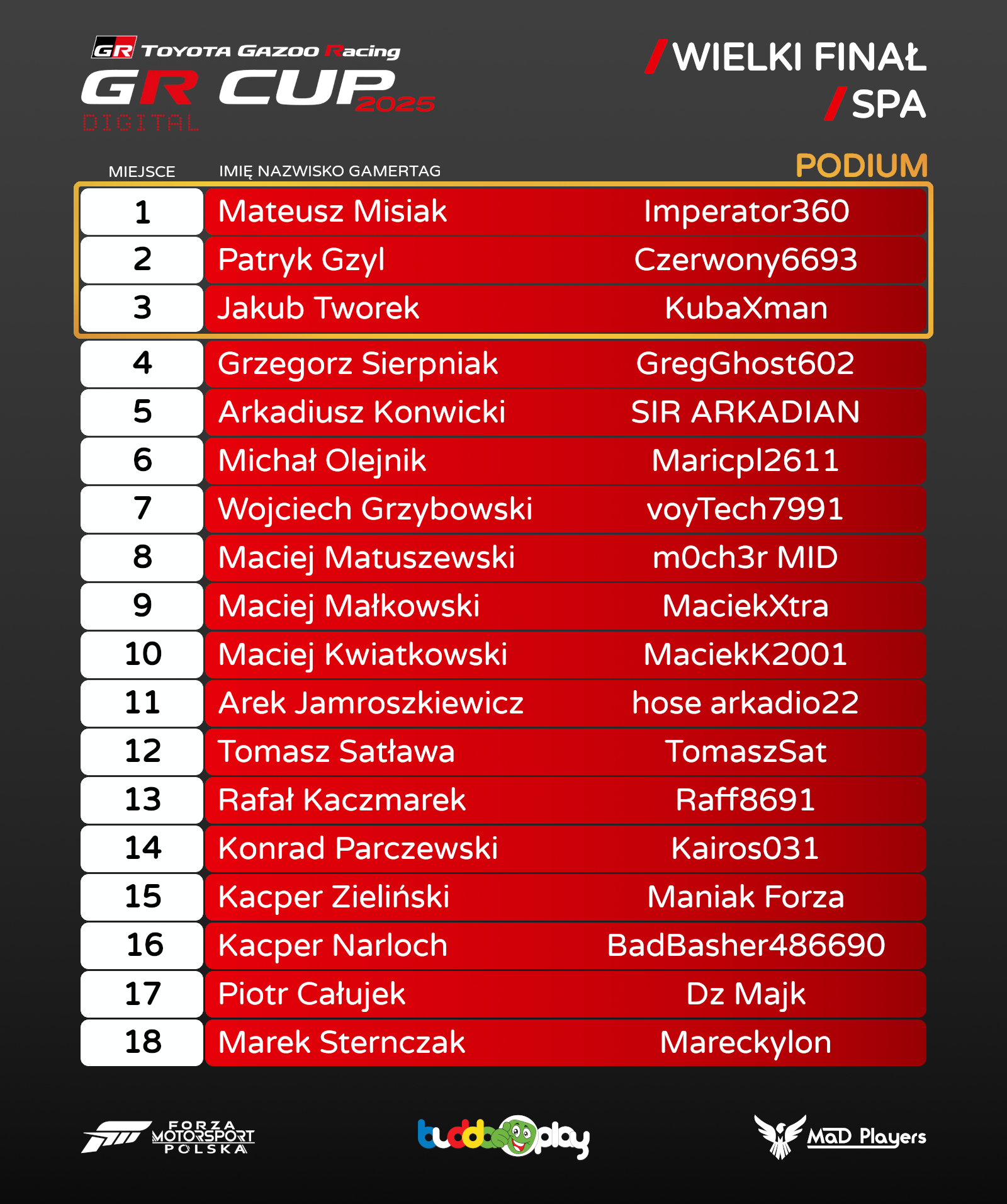 Zwycięzcy Wielkiego Finału zdobyli tytuły Mistrza, Wicemistrza i II Wicemistrza TOYOTA GR CUP DIGITAL 2025 oraz nagrody rzeczowe o łącznej wartości 15 tys. złotych. Najlepsza trójka graczy w ramach wygranej będzie mogła także zasmakować prawdziwej jazdy na torze w wyjątkowych sportowych autach Toyoty z linii GAZOO Racing podczas imprezy GR ZLOT 22 listopada na Autodromie Słomczyn.