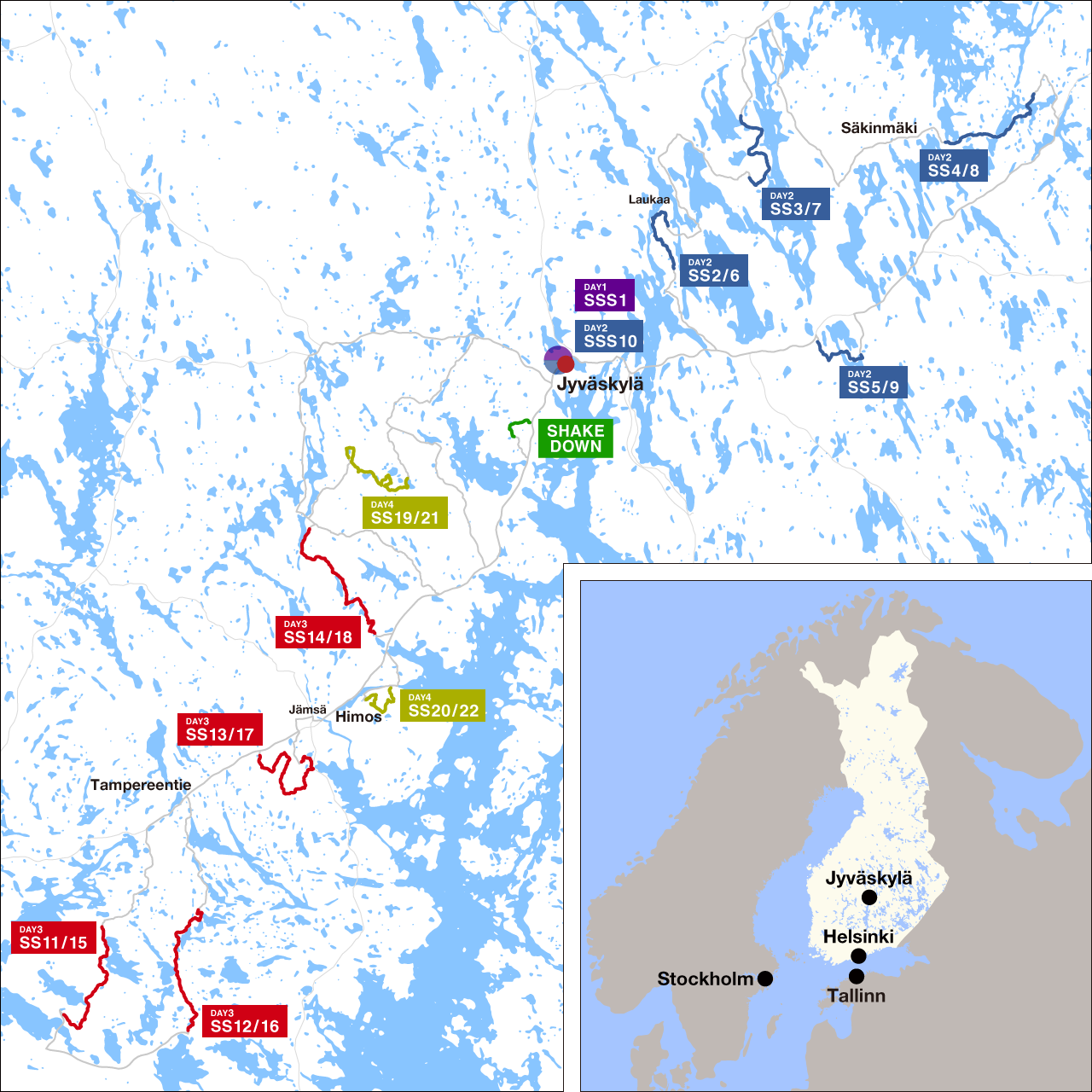Rajd Finlandii to najszybsza impreza w kalendarzu WRC. Szutrowe drogi pozwalają osiągać niesamowite prędkości, ale wymagają niesamowitej odwagi, bo prowadzą przez gęste lasy oraz przy malowniczych jeziorach. Dodatkową atrakcją dla kibiców są hopy, z których auta wyskakują na kilkadziesiąt metrów. Tegoroczna trasa liczy 22 odcinki specjalne o łącznej długości 320 km.
